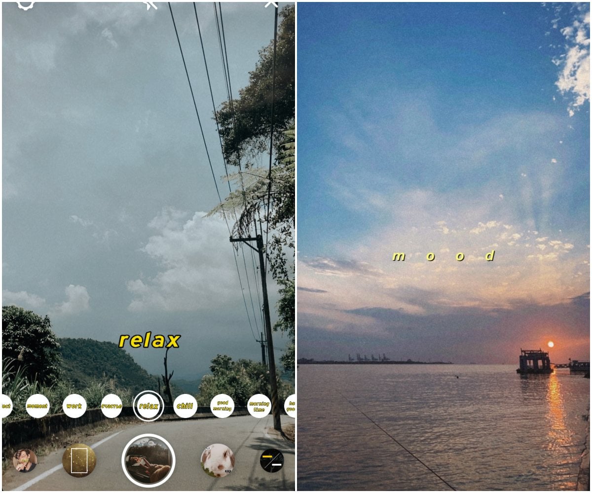 左圖的「SUBTITLES∞」也是走復古濾鏡,內多種情境文字,像是relax、love it、chill等等,可用來記錄工作、聚會、享用美食或酒攤,相當地實用;右圖的「MOOD」同樣是復古濾鏡,點選螢幕即可改變mood的位置,推薦大家用它來拍藍天或黃昏。