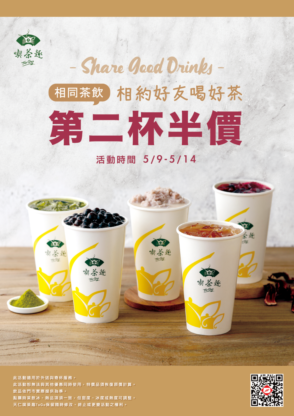 等待已久的喫茶控們,手搖飲界名品-天仁喫茶趣ToGo相同品項第二件半價優惠活動開跑。5/9-5/14連續六天全品項皆享有相同飲品第二杯半價優惠。