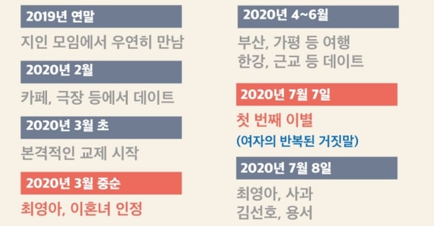 時隔6天的時間,10月26日韓媒Dispatch再次獨家曝光「22個交往時間線」,前女友正是前氣象主播「崔英雅(최영아)」,2019年末認識、2020年3月初交往、2020年3月中女方男方得知女方離婚過、2020年7月7日第一次分手(女方反覆說謊成性)、2020年7月24日女方懷孕、2020年7月27日協議墮胎,期間幫女方煮海帶湯、送補藥、領養愛犬「虎雅」,並介紹給朋友、父母認識等,直到2021年5月正式分手,直接打臉前女友所說的不聞不問和墮胎前後的反覆態度!(D社完整內容)