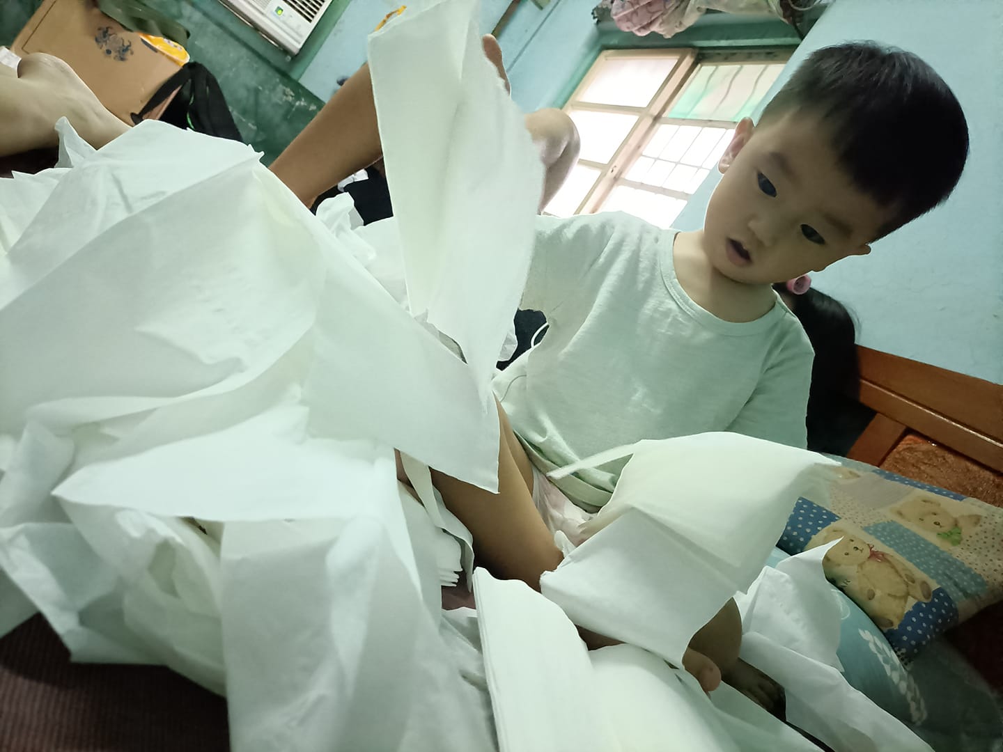 (把尿布通通翻出來、再爬去看佩佩豬,好像身後的混亂跟他無關一樣)