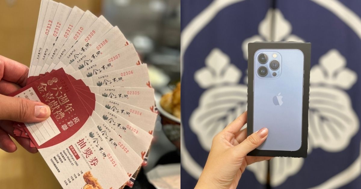 獎項:iPhone13 Pro 128GB(市價32,900)1名、Apple Watch S7(市價13,900)1名、帝王蟹天丼(市價760元)10名、江戶前天丼(市價420元)10名、天丼(市價350元)10名、100元餐點抵用券50名。