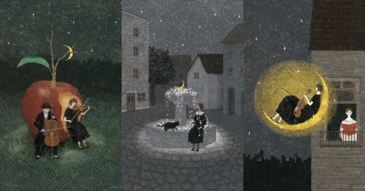 日下明插畫的元素基本都來自現實:各類樂器、植物、星星、月亮、小船、小熊、小鹿和其他各種生物演奏著樂器,營造出一種怡然的景象,觀看著彷彿能夠聽到動物們演奏的音樂。日下明通過自己奇特的想像力,將其組織成一幅幅充滿奇思妙想的美麗畫面。