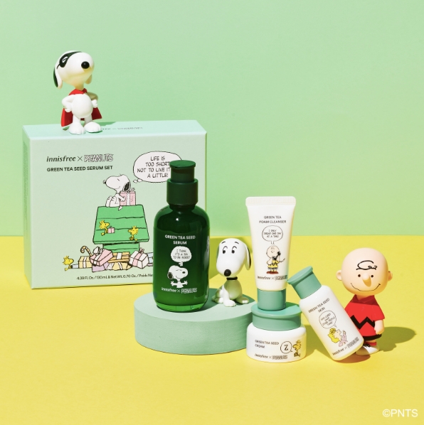 innisfree 明星產品「綠茶籽保濕精華」萃取自珍貴的濟州美肌綠茶,蘊含五種玻尿酸、鮮榨綠茶水、綠茶益生菌科技,是很多鐵粉會一直回購的品項。這次也特別推出史努比限定版組合,外包裝盒跟瓶身都換上可愛的圖案,用完都捨不得丟!