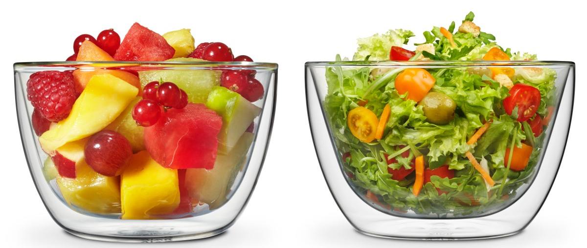 經典雙層碗款分為13cm及18cm廣口設計,雙層Borosilicate材質具有隔層效果,從冰藏拿出夏日輕食水果、沙拉等可防止水漬形成滴落桌面上,以及具有耐熱高硼矽玻璃,圓碗造型盛裝像是泡麵、濃湯不擔心燙手好端拿,具有耐腐蝕材質也能安心使用洗碗機清洗,輕巧材質不論是在外租房族或是單身小資族好收納冬夏皆宜好使用。