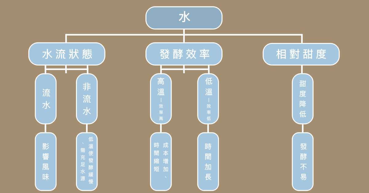 發酵的四元素:水分、糖分、溫度以及微生物,前三種變因是一般處理廠較易控制的項目,只要調整其中一項,即可獲得不同的結果。
