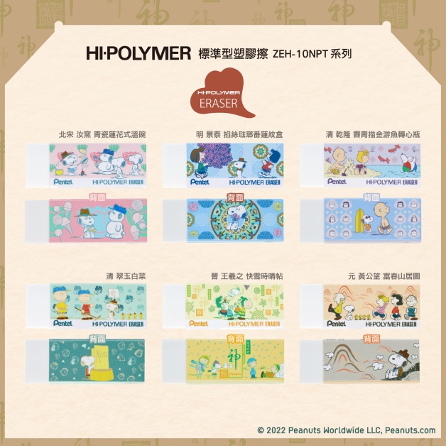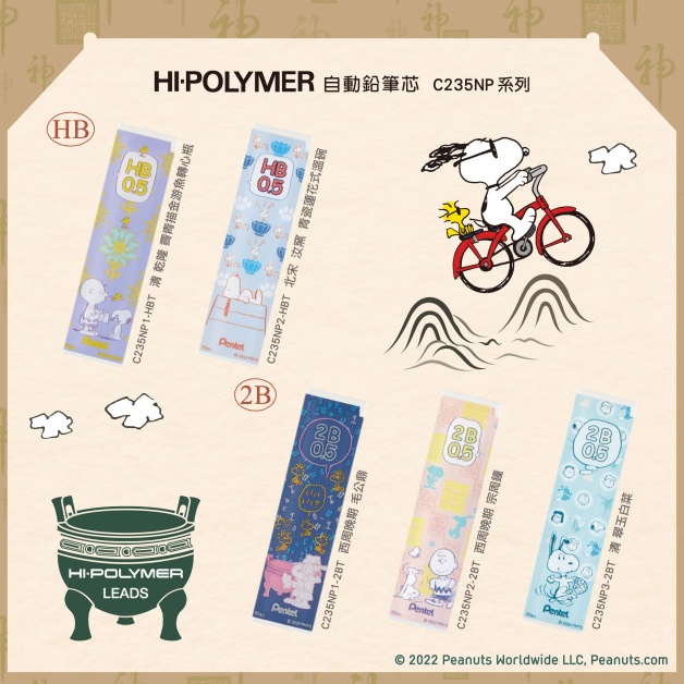 HI-POLYMER自動鉛筆芯」HB有「紫色款霽青描金游魚轉心瓶」和「藍色款青瓷蓮花式溫碗」;2B有「靛色款毛公鼎」、「粉色款宗周鐘」、「淺藍款翠玉白菜」,其中最可愛的毛公鼎,可見史努比化身考古學家,認真研究文化遺跡!