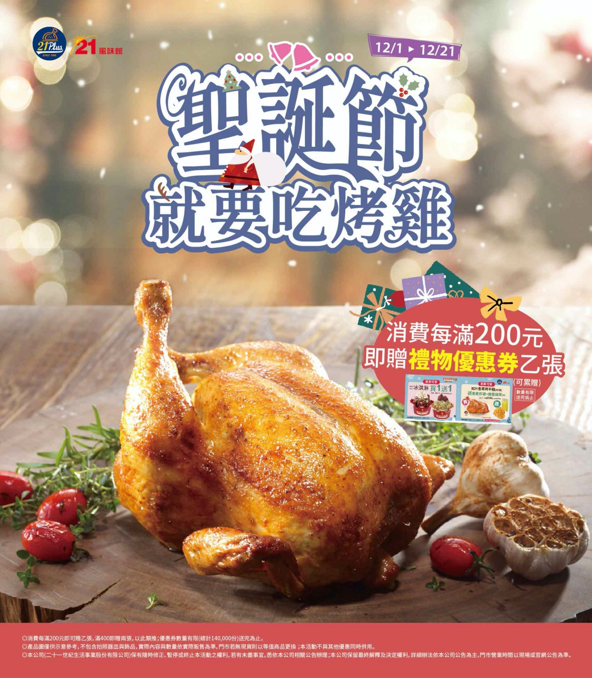 想來份烤雞大餐的妞妞們,12/1-12/21期間只要到21世紀風味館消費滿200元,就能獲得聖誕禮物優惠券一張。優惠內容包括了COLD STONE冰淇淋買一送一券等,妞妞們可以吃又可以拿禮物,大家可要好好把握呀!