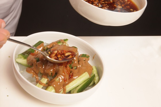 食材處理:小黃瓜可以先冷藏,待食用時再拍碎切段即可;無糖花生醬,保師傅推薦使用寶島牌*,量約芝麻醬的三分之一至四分之一,而芝麻香油是幫忙調勻兩者所使用;如果家中沒有棉糖也可以換成砂糖 (份量一樣,但顆粒較粗需要溶解時間較長)