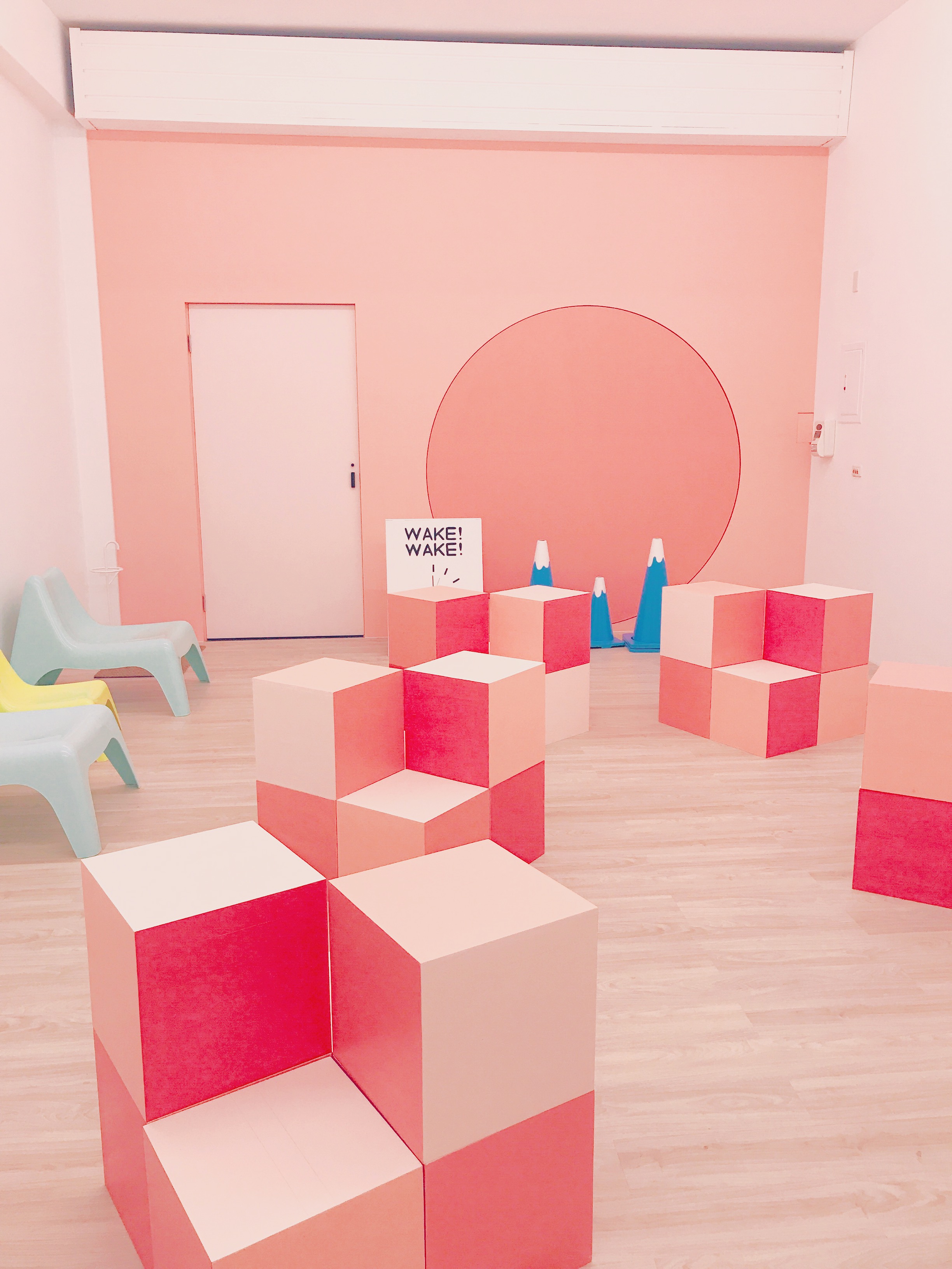 店內設計以美術館為概念(妞編輯覺得這整間店就是一個藝術品啊),《醒醒工作室》將粉色的方塊積木排列組合,結合創意與老闆娘們的小巧思,有別於一般的桌椅,就像是裝置藝術,來到店內的客人都能像藝術品般,以不同的姿態展示。(真的像是藝術空間一點都不像是甜點店餒)