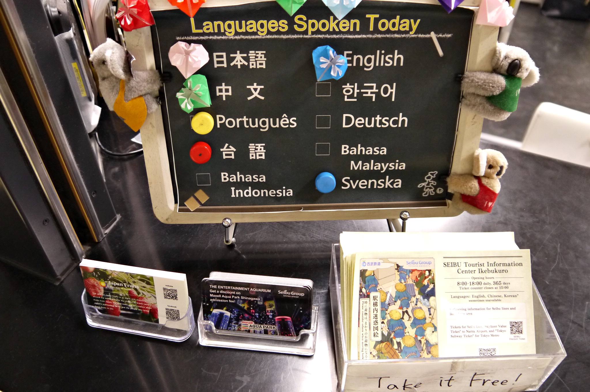目前西武鐵道有提供外語對應的服務中心只有西武新宿站跟池袋站兩處,西武新宿站是從8點到14點,而池袋站是8點到18點。對應的語言要看當日值班的人員而定,當然英文與日文,是基本必備款,偶爾講台語嘛會通喔!我們有特別製作一個小板子標示當日可對應的語言。其他車站雖然沒有配置專門對應外語的人員,但是有碰到什麼與外籍旅客溝通上的問題時,就會用專用的通訊軟體,即時來電跟我們進行視訊上的溝通。
