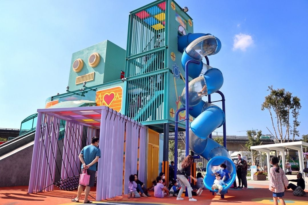 高雄市政府在鳳山全新打造的「保安兒童貨櫃主題公園」,以「機器人」為主題,規劃了6公尺高的1080度旋轉溜滑梯、立體攀爬牆、彩繪牆等設施,整個園區佔地約1.95公頃,還附設廁所,停車也很方便,非常適合親子妞妞們帶小孩來放電。