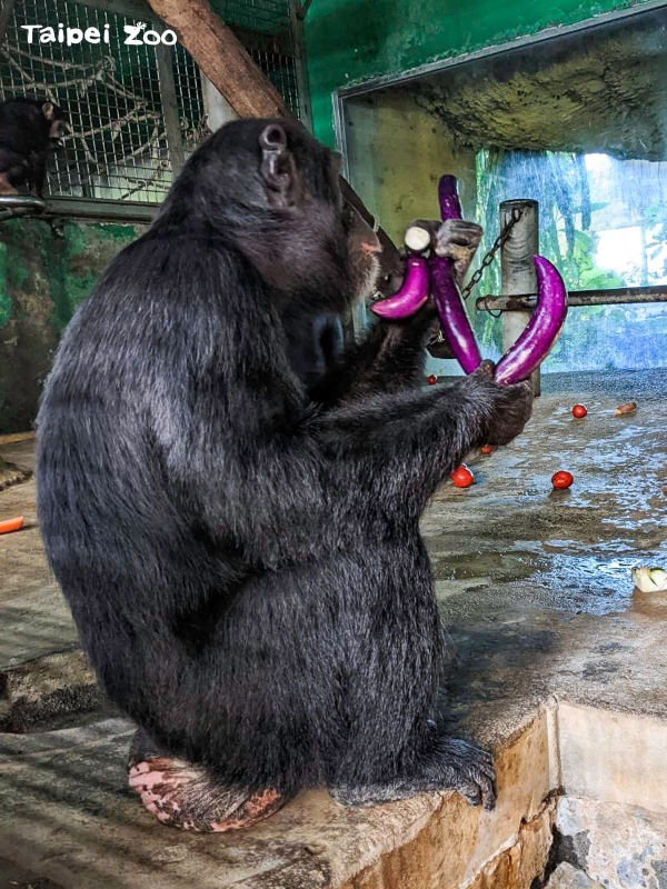 除了曬出猩猩們的「擺盤照」,園方也加碼公開黑猩猩的食譜!黑猩猩是雜食性動物,主食以素食為主,牠們偏愛口感脆脆的高麗菜、空心菜,而有著「大人版三色豆」外號的苦瓜、青椒、茄子竟也是黑猩猩的心頭好,甚至會為了搶茄子吵架,看著黑猩猩珍惜手中茄子的畫面,意外的十分可愛耶~