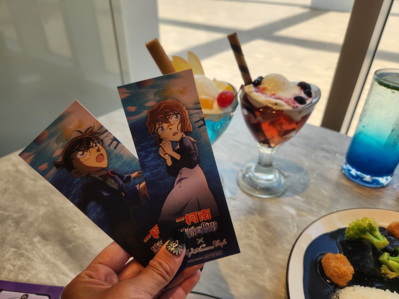 除了精緻的主題裝潢,主題Cafe更以《名偵探柯南:黑鐵的魚影》重要角色設計餐點,粉絲可品嚐包含柯南、小哀、安室、赤井、小蘭、黑衣組織等人的專屬餐點,包含主餐、甜點、聖代、飲料,還能自己搭配喜歡的CP餐點(支持柯哀CP的妞妞絕對要看《名偵探柯南:黑鐵的魚影》)。
