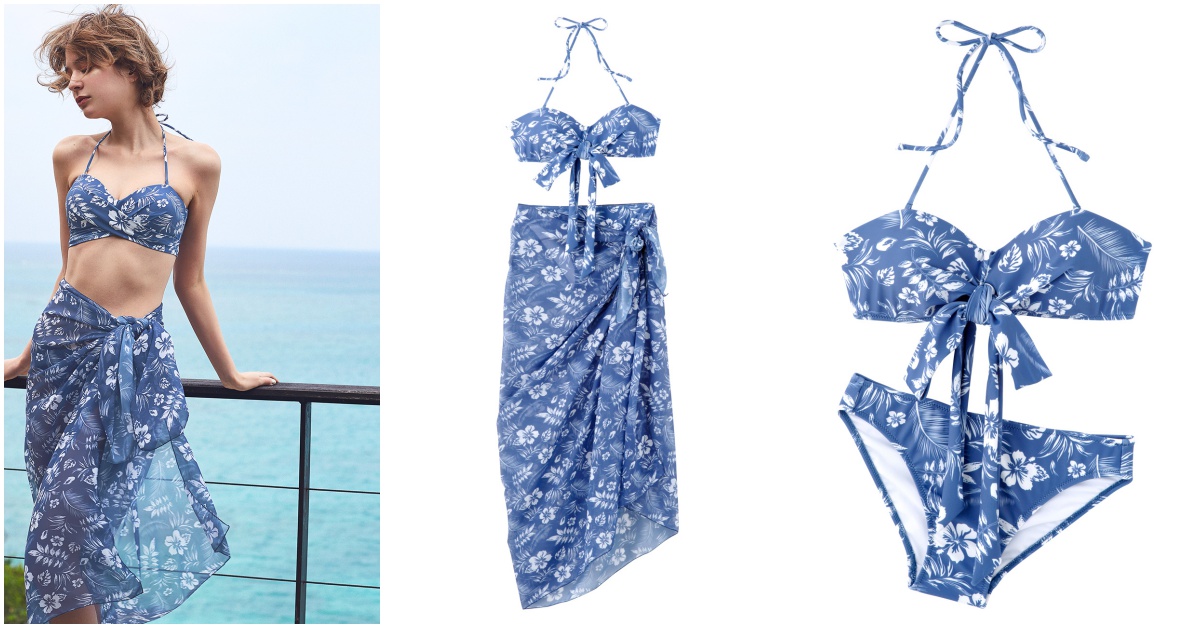 渡假印花比基尼沙龍泳裝組 水藍色 NT.2290