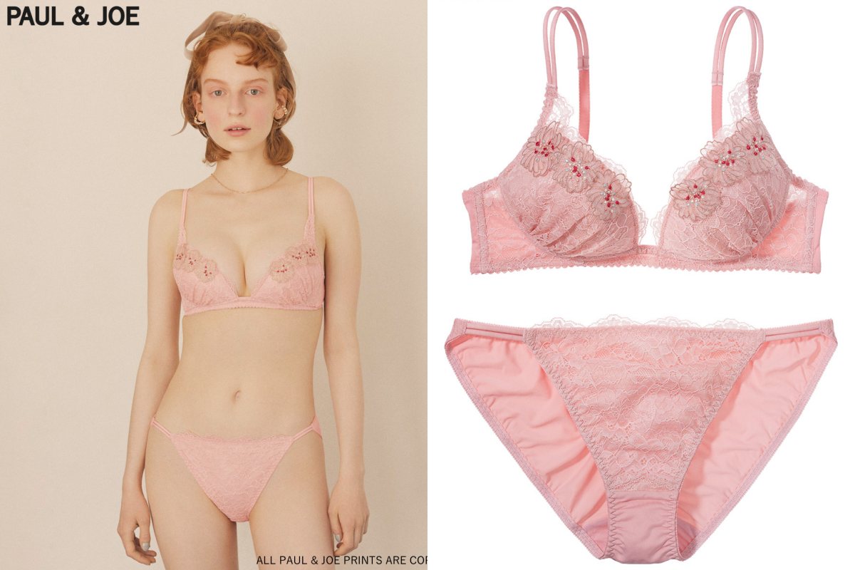 近年來無鋼圈內衣的舒適感也成為女孩選擇的熱門款,在這次的聯名系列中,這套以甜美的粉色系的內衣組絕對是無鋼圈內衣界的性感擔當,罩杯全體使用彈性蕾絲,上緣搭配PAUL & JOE的「西洋菊」刺繡裝飾,舒適又有小性感~