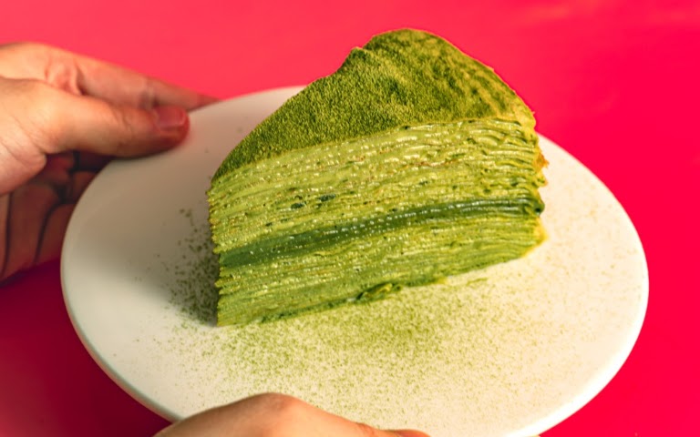 「幸福肥手作點心」的抹茶千層,整顆都是用日本高級抹茶粉「小山園」製作,經過超過 10 次的調整,找出「65% 濃度」抹茶的黃金比例!65% 是一種微苦回甘的滋味,帶有抹茶苦&香,並且帶有回甘。工作室「層層把關」,超過 6 公克重量的餅皮,就不會採用,為的是讓吃貨們享受「皮薄餡多」的絕佳口感,搭配淋醬更是大滿足!