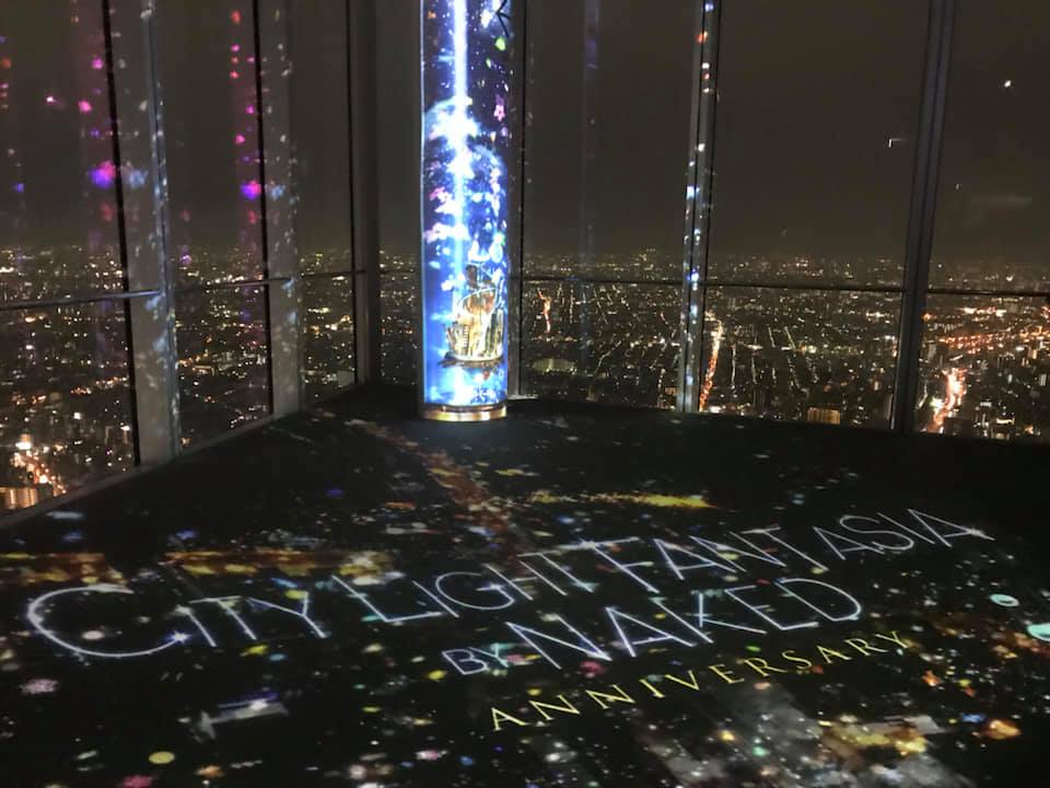 這次的主題是「ANNIVERSARY」,在60樓的窗戶上就能直接看見各式各樣的夢幻投影,將360度玻璃環繞特色發揮到極致,海中生物、星光變換讓你彷彿漫遊空中。
