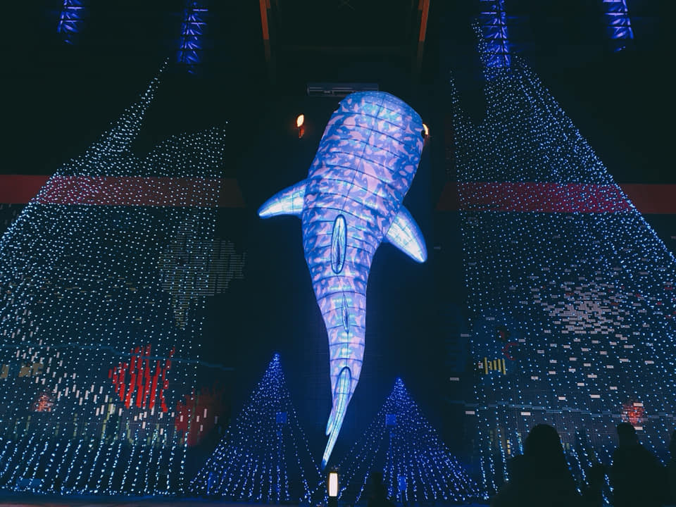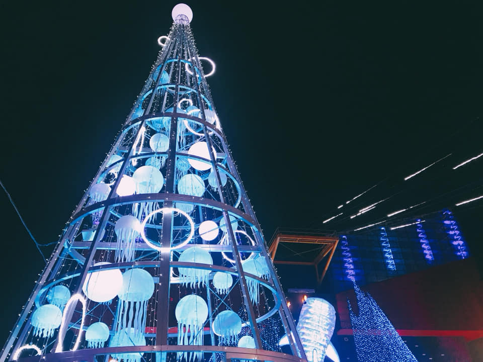 今年冬天是巨大鯨鯊裝置藝術,夜晚一旁還有感應式聖誕樹、點燈企鵝,後方更有摩天輪,瞬間點亮整個夜空。