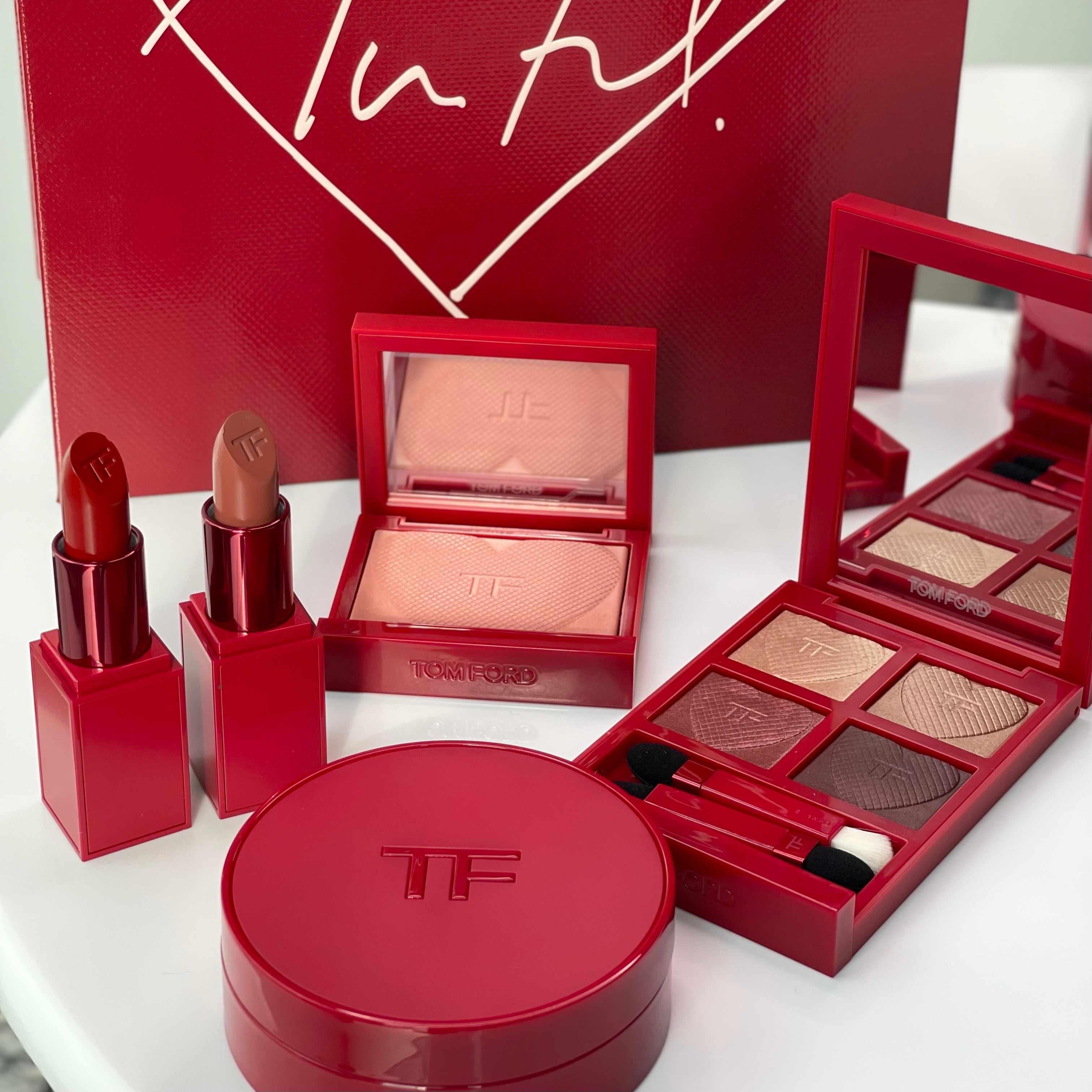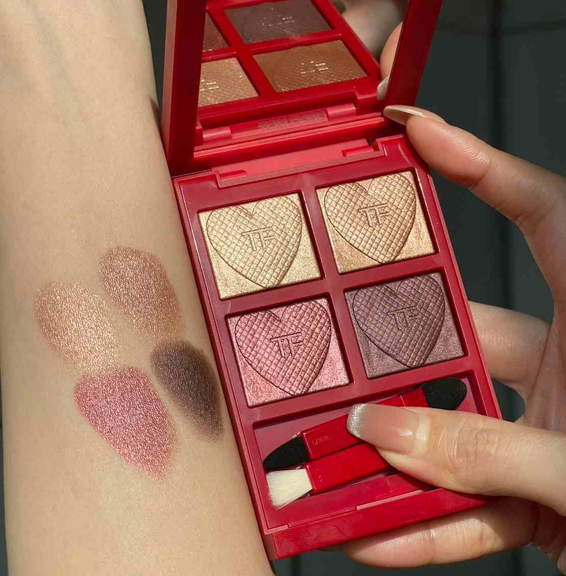 TOM FORD的經典四格眼盤變少女了!除了外衣穿上炙熱紅色,打開來的四格眼影都壓印立體愛心,金屬質感的巧克力可可棕配色,乾刷可打造柔和的煙燻妝。