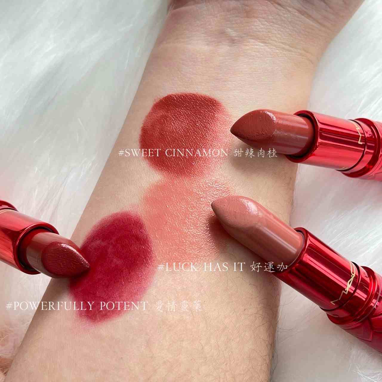 龍鱗片也能可可愛愛!M·A·C應景的將龍年的元素和情人節結合,以愛心為靈感打造了熾愛之心限量系列,全系列外包裝都佈滿了愛心形狀的祥龍鱗片,