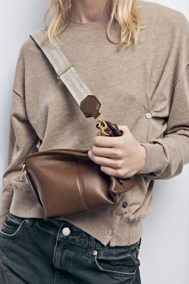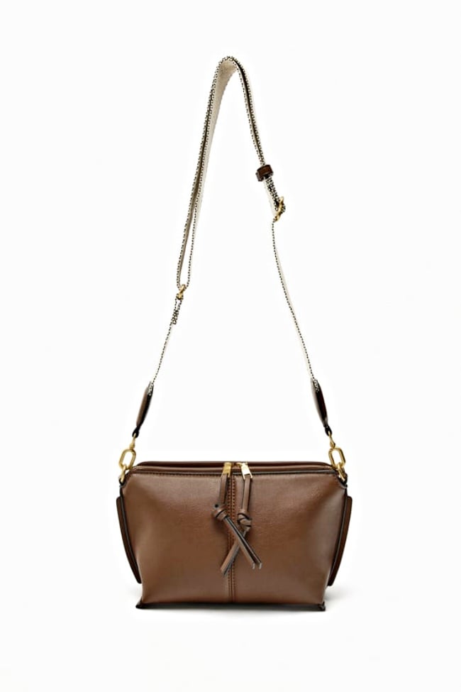 校園文青風也可以用巧克力棕完美營造!ZARA的這咖斜背包除了耐看的咖啡棕色之外,還加入黑色細節、金色釦環,俐落簡約的包型設計,用「一條布面材質背帶」增加青春休閒感,簡單搭上大學T、針織衫或是帽T就超減齡~
