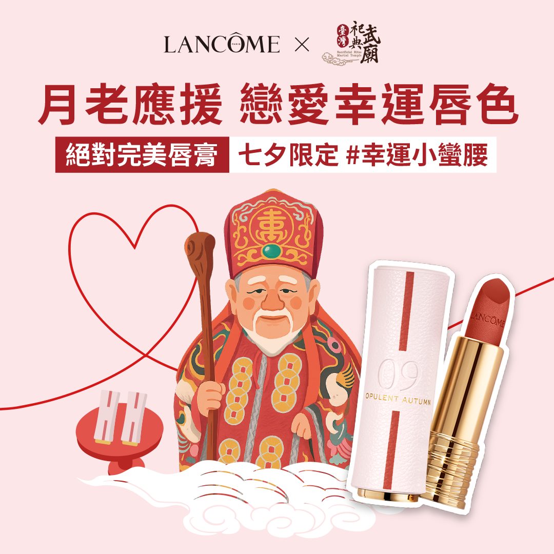 除了浪漫紅線唇膏外,還特別找專司正緣、被網友封為全台最靈月老之一的「臺灣祀典武廟月老」應援,推出限量「月老隨行幸運紅線組」,即日起到8月31日,於蘭蔻官方通路(含全台蘭蔻專櫃、官網、MOMO旗艦館、蝦皮旗艦店),只要購買任一七夕限定唇膏,即可獲得「月老隨行幸運紅線組」乙份,內含月老過爐紅線、緣粉與天賜良緣紅包袋。 *贈品數量有限,贈完為止