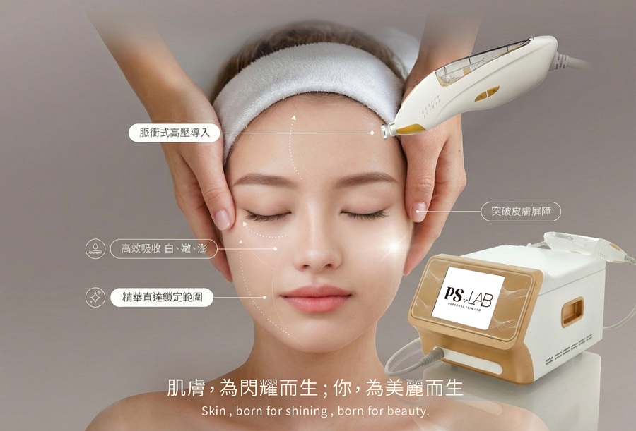 PS+LAB利用氣動脈衝無針導入科技,30分鐘完成全臉水光課程。