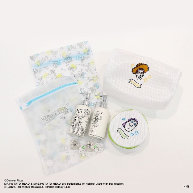 居家用品部分,推出了杯子、盤子、手帕、洗手乳瓶、牙刷架、小型洗衣袋等,風格走的是可愛活潑的漫畫風,在商品上可以看到胡迪、巴斯光年、翠絲等經典角色的身影哦!