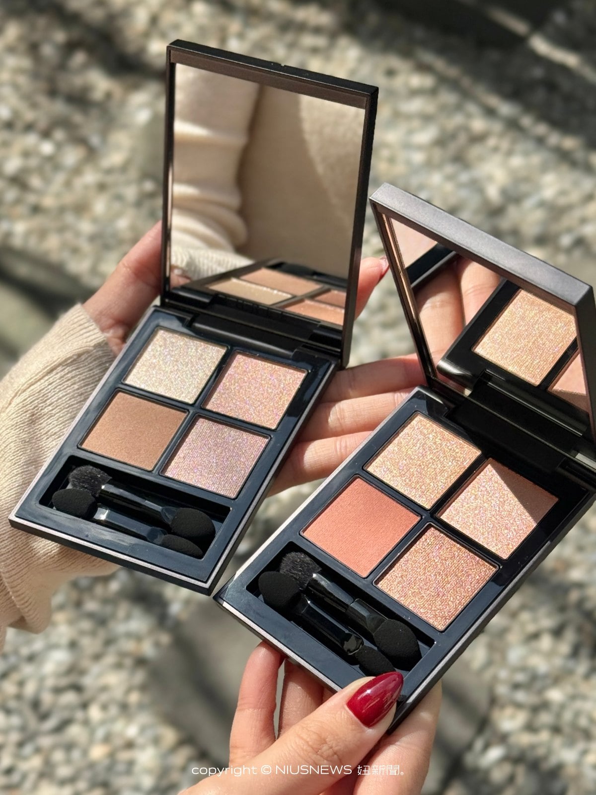 茶色系眼影控會愛死!星紗流光四色眼影盤推出兩款新色,一盤集結了四種質地,包含緞光、金屬光澤、霧面、薄紗,每種色調都含紅色珠光,溫暖色調為眼神注入力量,不論是在陽光、燈光下,都能保持亮澤。中性色調輕盈的質地,單擦細膩,即使層層疊擦依舊通透、不厚重,是一款能打造輕盈與深邃感並存的眼影盤。