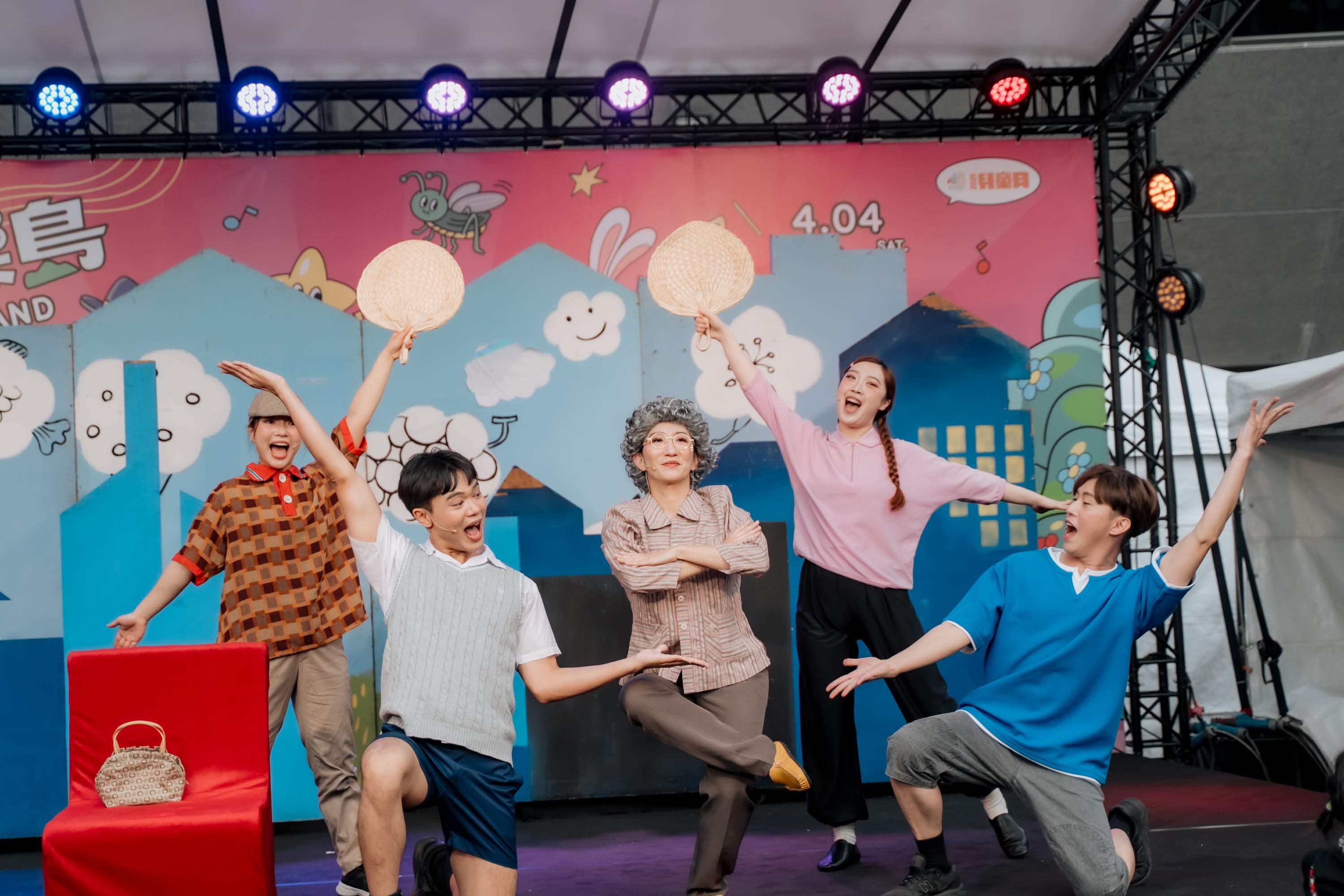 「歡樂島大劇院」舞台由YOYO家族領軍展開《歡樂島點點名》,深受大家喜愛的香蕉哥哥在現場感性表示:「每個人都可以過兒童節,這是屬於我們每一個人的節日。」瞬間炒熱現場氣氛,台下大小朋友身穿五彩雨衣齊跳,雨水也澆不熄熱情!緊接著登場的「米特動物園」以《薩克歷險記》帶來精彩的薩克斯風演出,現場親子隨著音樂旋律深陷故事情境。由趙自強(水果奶奶)創辦的「如果兒童劇團」更是本次活動音樂劇的焦點,活動首日透過全台語親子音樂劇《咱來搬演囝仔歌》精緻編曲重塑經典童謠,帶領大小朋友一起跨世代合唱;第二天則由《愛Party的蚱蜢》接力登場,充滿互動感的演出讓台下的孩子在歡笑中感受音樂劇魅力,讓北流戶外表演空間掌聲不斷。
