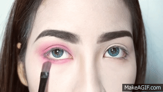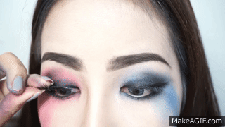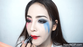 利用深淺兩種桃紅色眼影,深色先塗在雙眼皮眼褶,淺桃紅在大面積的刷在上眼皮以及下眼瞼處。最後用手指從眼尾向下拉出淚痕一樣的兩條痕跡,製造出小丑女驚世駭俗的誇張眼妝。另一邊藍色眼妝也是利用深淺兩種藍色,重複同樣的步驟畫出眼妝基底。