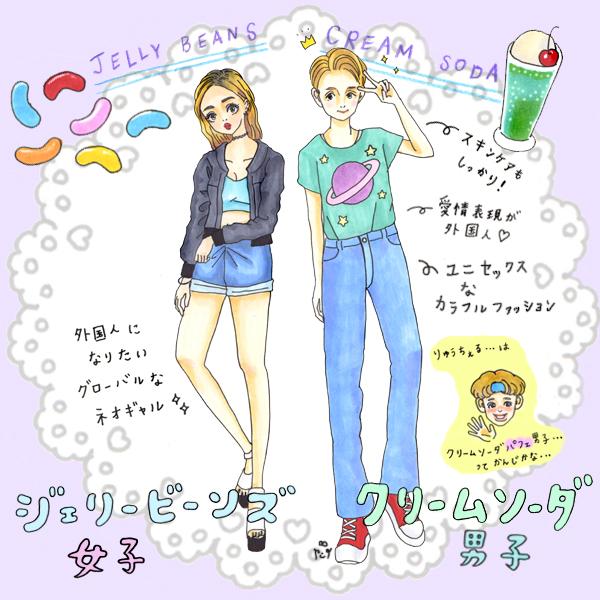 大家看到這個類型的男女有沒有一股熟悉感!?根本就是我們人氣情侶Peco還有龍二啊~雷根糖女孩全身上下都散發出一股走在潮流尖端的感覺!亮色系的髮色、粗眉以及外國人感的變色片,衣著方面則是走色彩繽紛且多露出的風格~通常SNS上總是分享與時尚、華麗的生活相關的狀態,並且擁有許多外國朋友也非常憧憬海外生活。