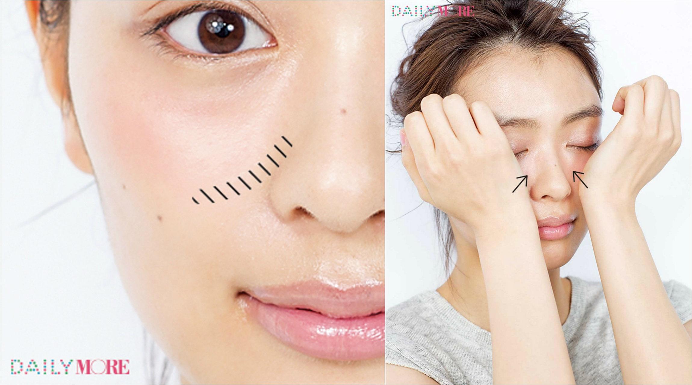 接著從眼下的三角區塊開始按摩,這部分的肌膚如果可以展現出緊實有彈性的樣貌,臉的印象也會有很不同的感覺喔!而按摩的方式就是用拇指與食指輕捏,在保養時搭配這個手法就能讓眼下的三角區塊更加緊實、輪廓更加俐落~