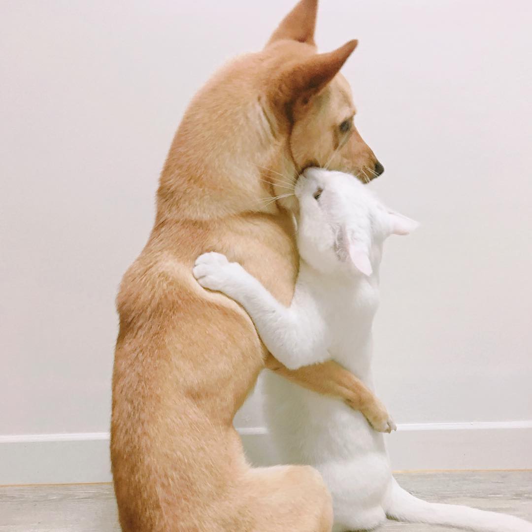 相親相愛的互相挑釁!(貓咪북끄也吃太好,身材跟狗狗두부有得比耶!)