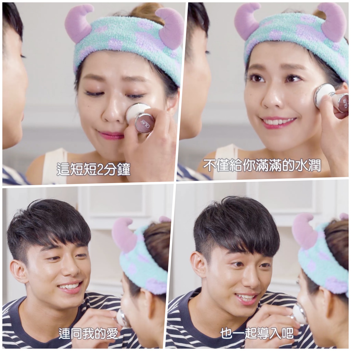 原來她們的秘密武器就是OLAY微磁導入緊緻面膜!將面膜塗抹在臉上後,拿出微磁導入儀照著以下步驟按摩全臉,就能達到緊緻的功效,臉蛋啵亮且無瑕,讓男主的雙眼看得目不轉睛,進而獲得甜蜜蜜的愛情。