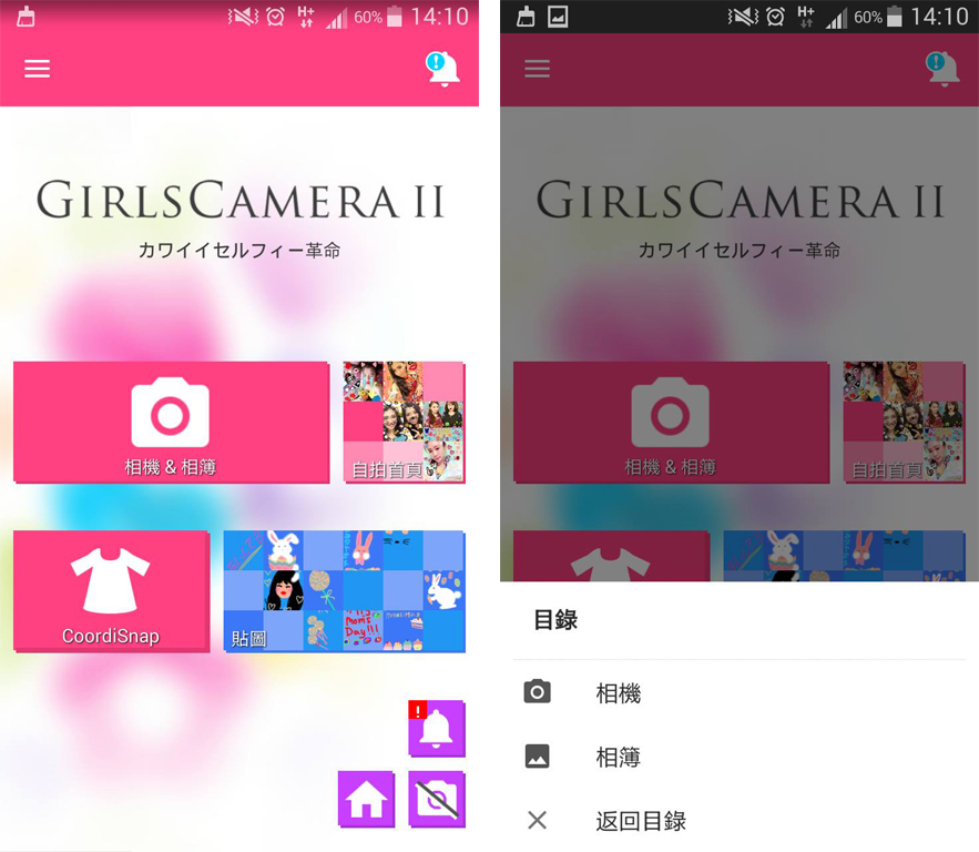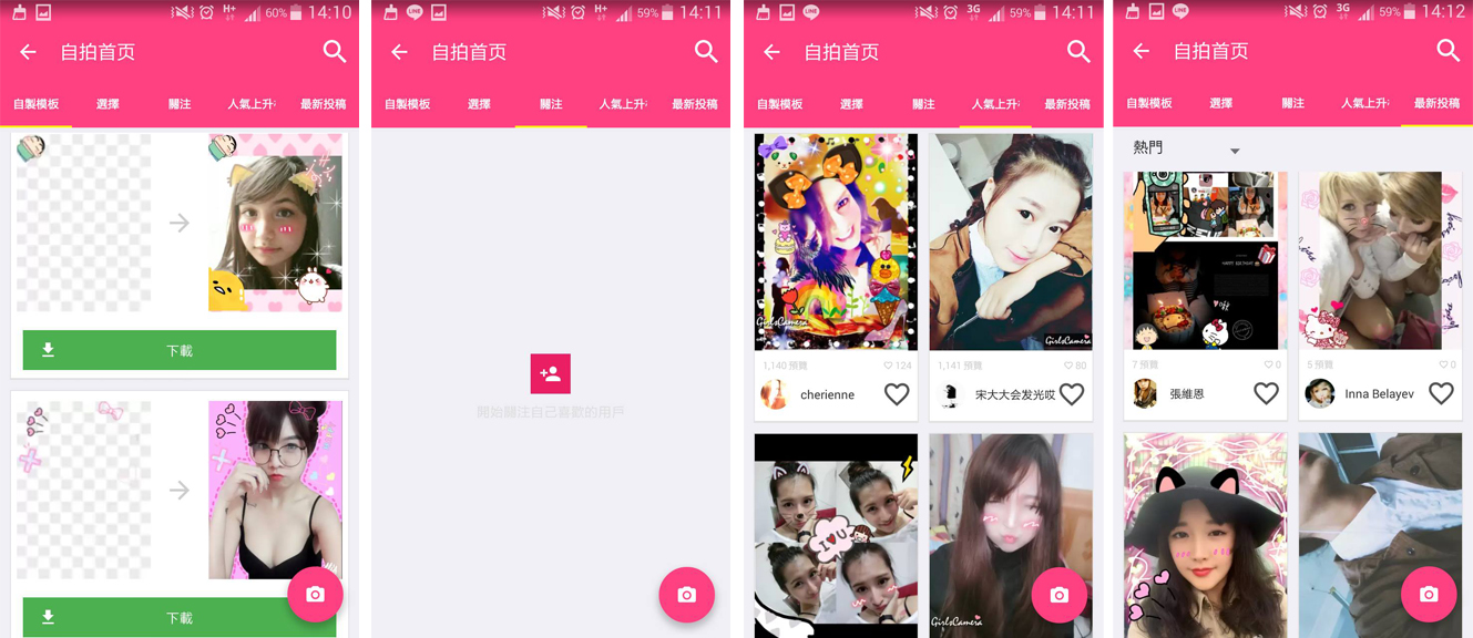 首頁非常簡潔乾淨,有相機以及相簿功能。自拍首頁則是可以看到其他用戶的自拍以及DIY貼圖分享。