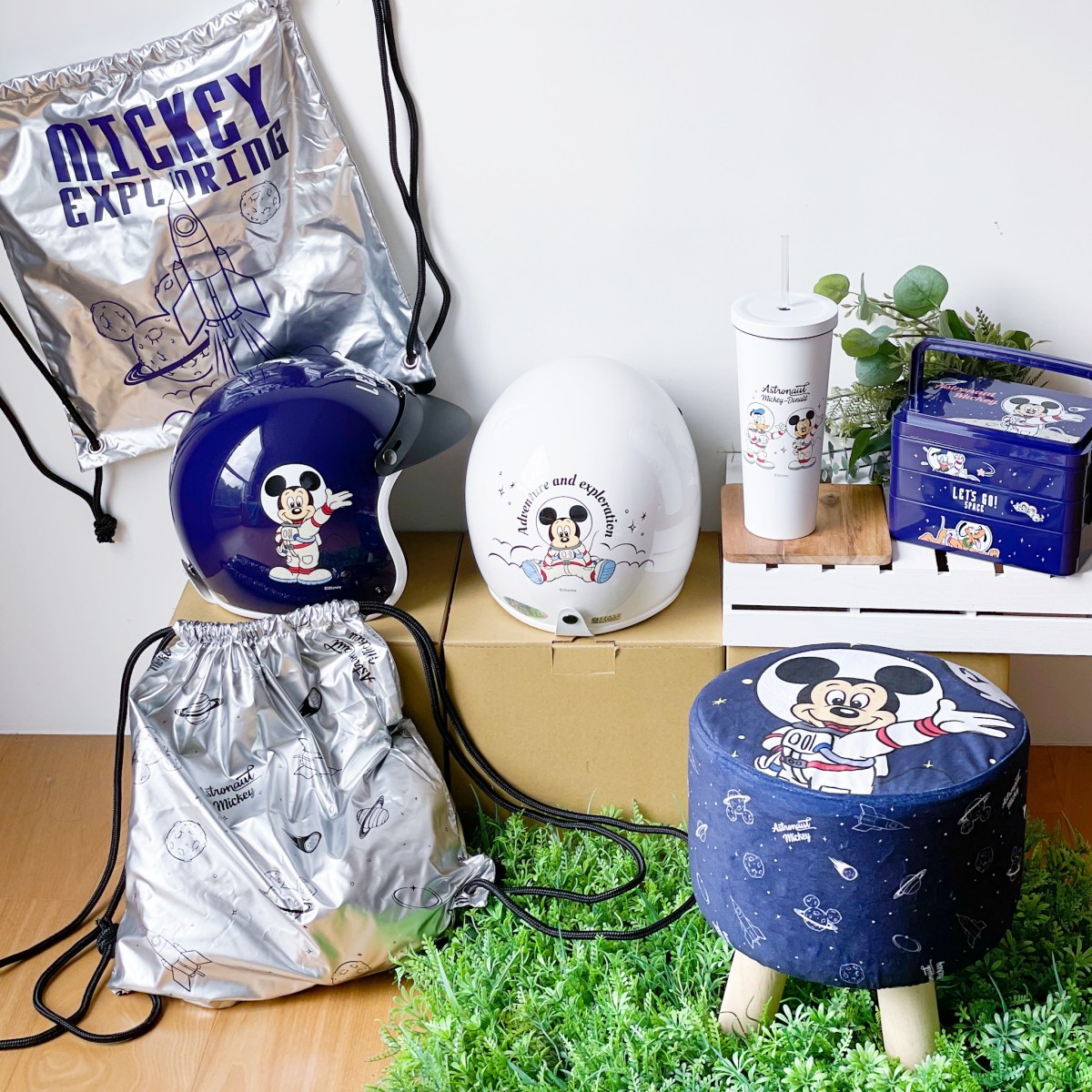 「漫遊太空迪士尼」安全帽組可愛地以太空人米奇、唐老鴨等角色為主角,有藍、白2種款式,組合內含帽子與收納袋;「漫遊太空米奇小圓凳」則以藍色與行星、火箭帶出宇宙感,正面是揮手打招呼的太空人米奇,布套可拆;「手提三層餐盒」共有3層,採分層與隱藏式提把設計,隨附餐具,超適合帶出門野餐!