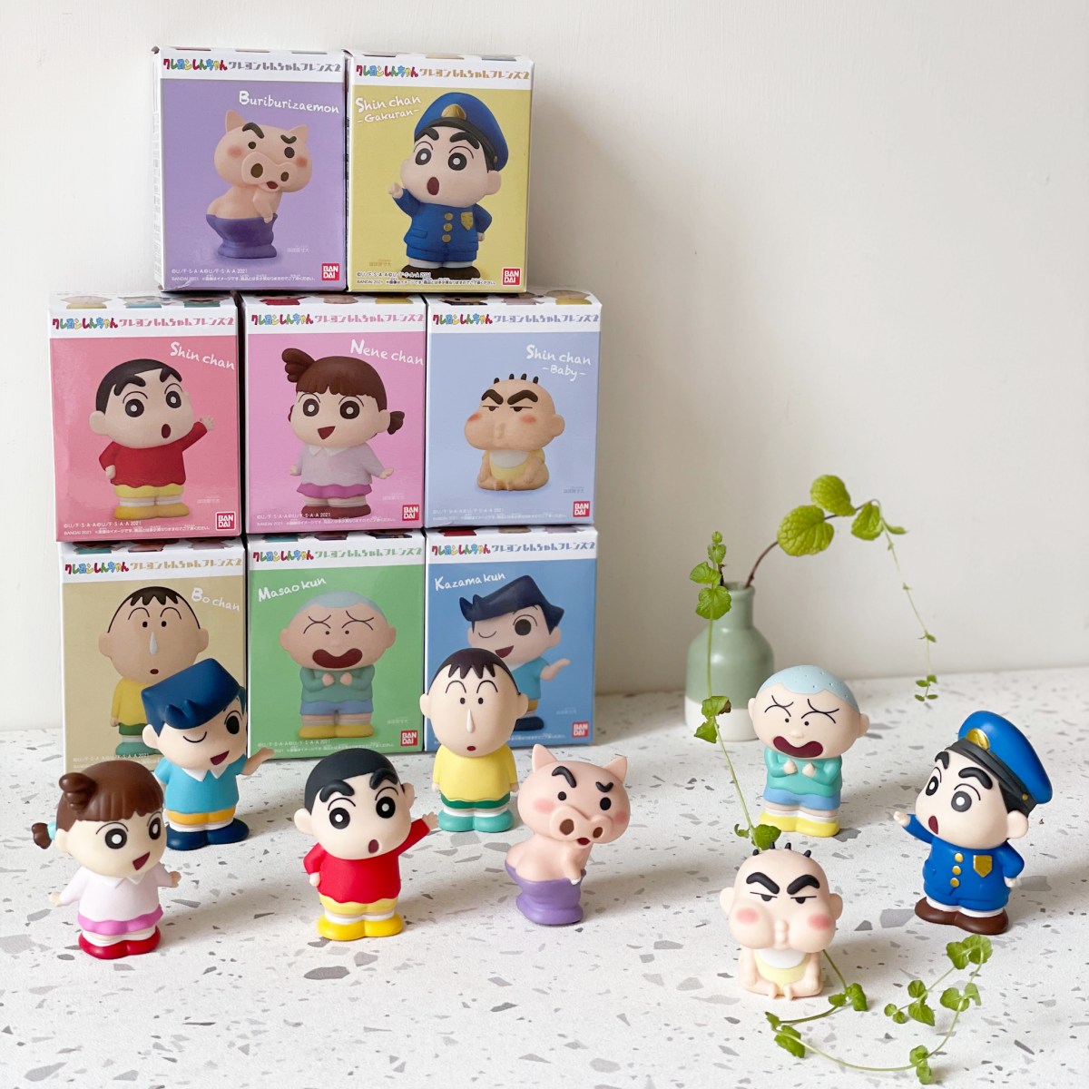 《蠟筆小新》全員以超萌軟膠公仔現身(共8種),登場角色有「春日部防衛隊」小新、風間、正男、妮妮、阿呆,以及肥嘟嘟佐衛門,其中小新更推出一般、嬰兒與學院服款,太欠整組全包!