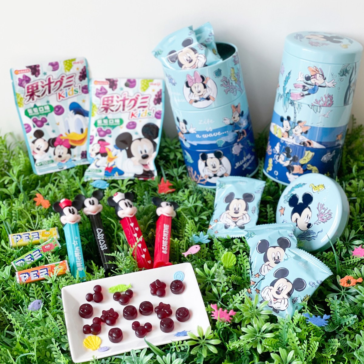 迪士尼零食部分,「米奇三層罐」鐵罐設計繽紛萌趣,吃完餅乾後盒子還能用來收納;「皮禮士貝思玩偶水果糖」以米奇、米妮為造型,相當有收藏價值;「明治果汁QQ軟糖」共有6款圖案,設計可愛得捨不得吃啊!