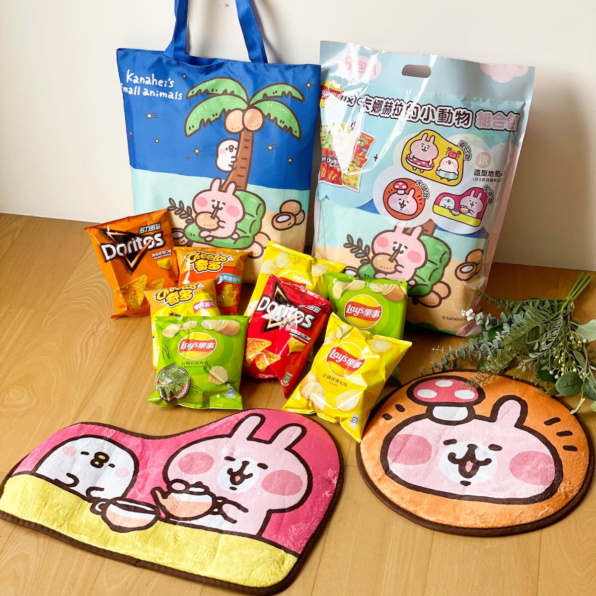 粉紅兔兔與P助粉絲,必收「樂事×卡娜赫拉分享包」!分享包一次奉上樂事、多力多滋、奇多8包綜合口味零嘴,並附贈聯名保冷拉鍊帆布袋與造型腳踏墊,吃的與用的一次滿足。