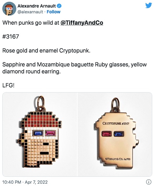 這次的合作想必與LVMH集團二公子、以及Tiffany品牌現任執行副總裁Alexandre Arnault的推動有很大的關係,因為在2022年4月時,Alexandre便早早在Twitter上搶先曬出了與他頭像CryptoPunk #3167同款的Tiffany墜飾,後來也是因為這個特製的墜飾促成與Chain首席執行長合作的契機!
