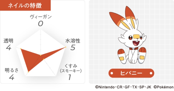 擁有高速度、高攻擊性特色的炎兔兒,指彩則是以透明的橘色調呈現,充滿活力元氣。