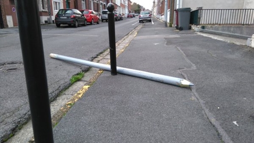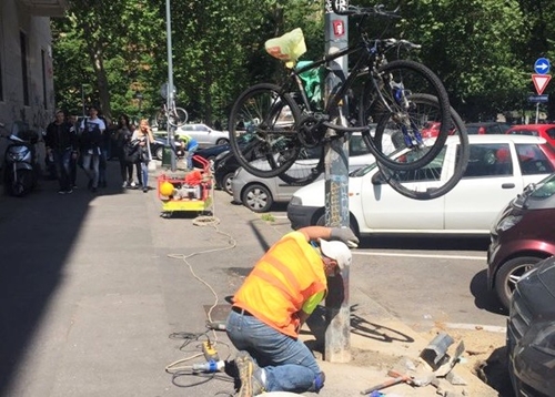 因為阻礙路燈施工,所以被懸掛起來的腳踏車。(牽到旁邊沒有比較快嗎?)