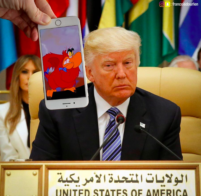 阿拉丁大反派賈方的臭鸚鵡艾格站在川普肩上,不知怎的一直想到康永哥啦!