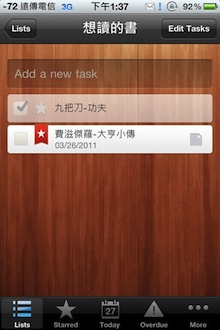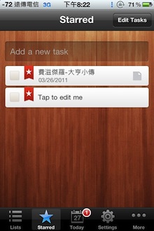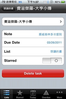 點進去後,我們可以針對此事項添加Note(附註)、Due Date(到期日)、List(選擇要歸納的清單)、Starred(加入最愛)。最下方的紅色按鈕,則是刪除此事項。