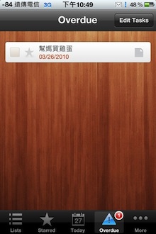 有的時候我們會因為過於忙碌或是健忘而使一些事項過期,不過總是有機會讓我們亡羊補牢;藉由查詢此項項目,就能知道哪些事情我們該做卻還沒做。 上面顯示的時間會是紅色的,表示事態緊急。