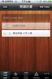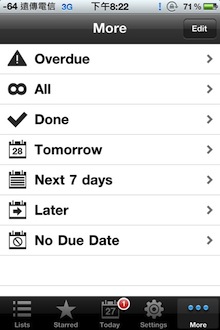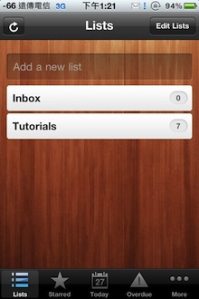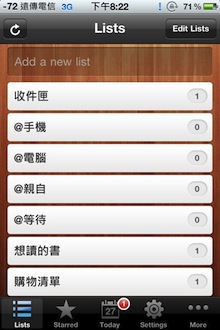 除了我們常使用的購物清單,書單之外,Wunderlist Task Manager還可以當做GTD的工具。(GTD為Getting Things Done的縮寫,是由David Allen提出的一種管理方法,主要是將事情集中在「收件匣」中,在整理時將其依照場合分類。詳細可以上網搜尋GTD。)