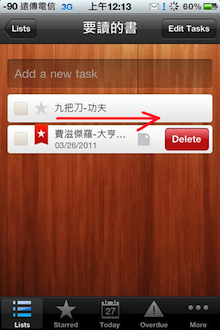 用手指在事項上滑一下,即會出現刪除按鈕,可以將此事項刪除。