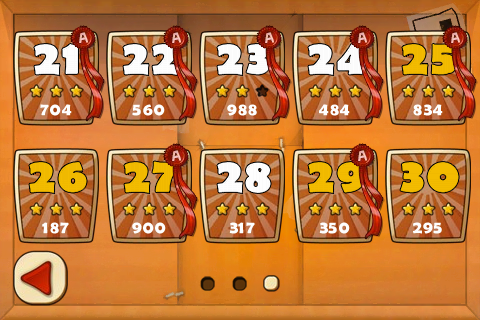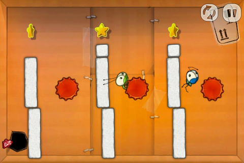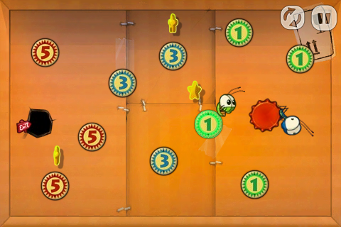 遊戲過程中從右上角的暫停鍵就可以看到目前的進度,其實只要成功把一隻蟲子送到出口就算過關了,但這當然不足以展現各位的高超技巧。勇於挑戰的玩家們可以在設定中關掉拋物線指引,只以箭頭與色棒來判斷彈射路徑,而更具難度的回報就是雙倍得分啦!成功在這個模式中過關還可以在關卡紀錄上得到一個小小的A哦!