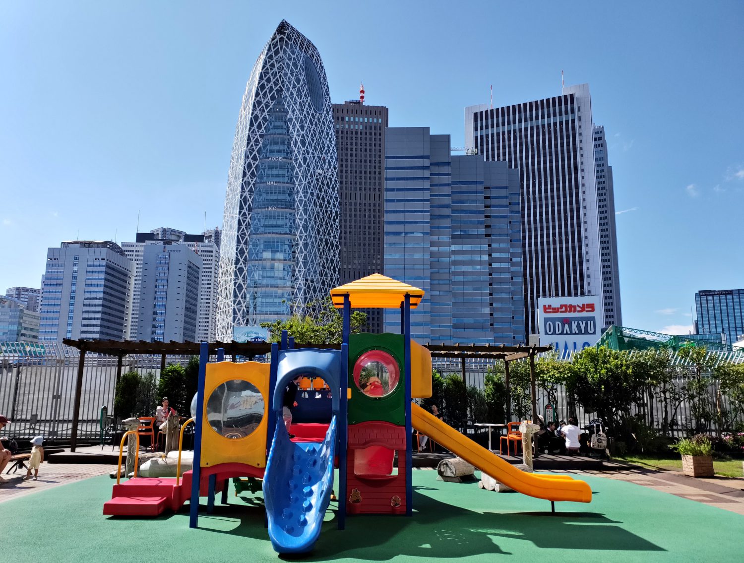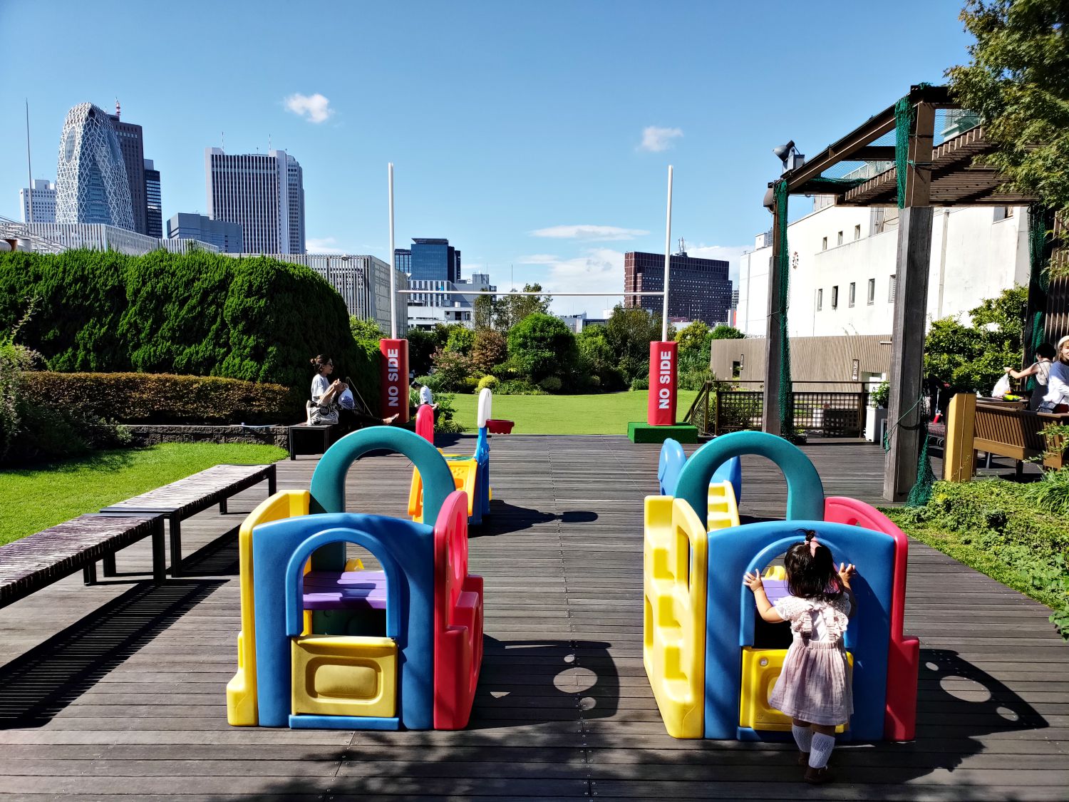 這個名為「屋上廣場」的空間,比較偏向一個戶外遊樂區,這邊有給小朋友玩的滑梯等設施,可以讓小孩在這裡盡情奔跑。眼前就可以看到東京MODE學園的特殊建築,以及西新宿的高樓景觀,可以一邊幫小孩放電,一邊欣賞美麗風光。
